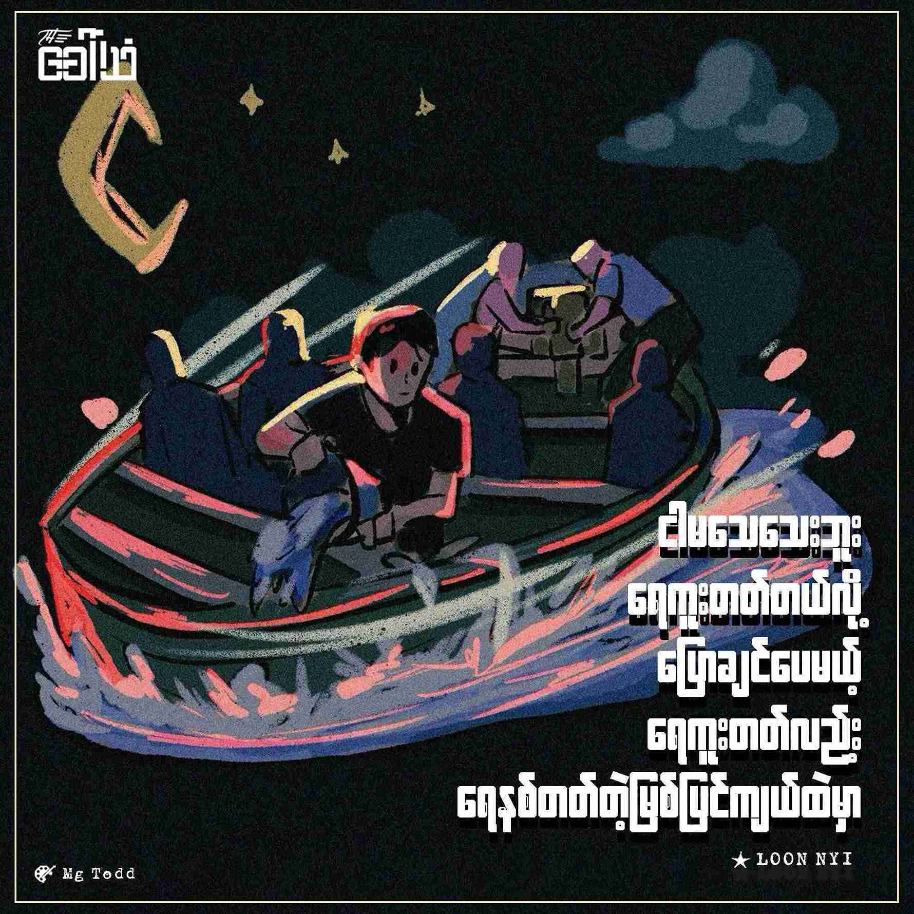 “ဟိတ်လူ ကျနော်တို့လှေထဲ ရေတွေဝင်နေတယ်”လို့ ကျနော်သတိပေးလိုက်သေးတယ် “ရေနည်းနည်းတော့ ဝင်မှာပေါ့ သိပ်လန့်မနေပါနဲ့ဗျာ”လို့လည်း ကျနော့်ကိုပြန်ပြောတယ်။ ဒါပေမယ့် ကျနော်တော့ ဆက်ပြီး တွေးနေတာပဲ။ ပစ္စည်းကလည်းများ လူကလည်း သာမန်ထက်ပိုများ၊ ပြီးတော့ ရေဝင်များတဲ့အခါ ရေအလေးချိန်နဲ့ဆိုရင်တော့ အတော်ဆိုးမှာပဲလို့ မတွေးရဲစရာကိုပါ ရဲရဲကြီး တွေးမိလာတယ်။