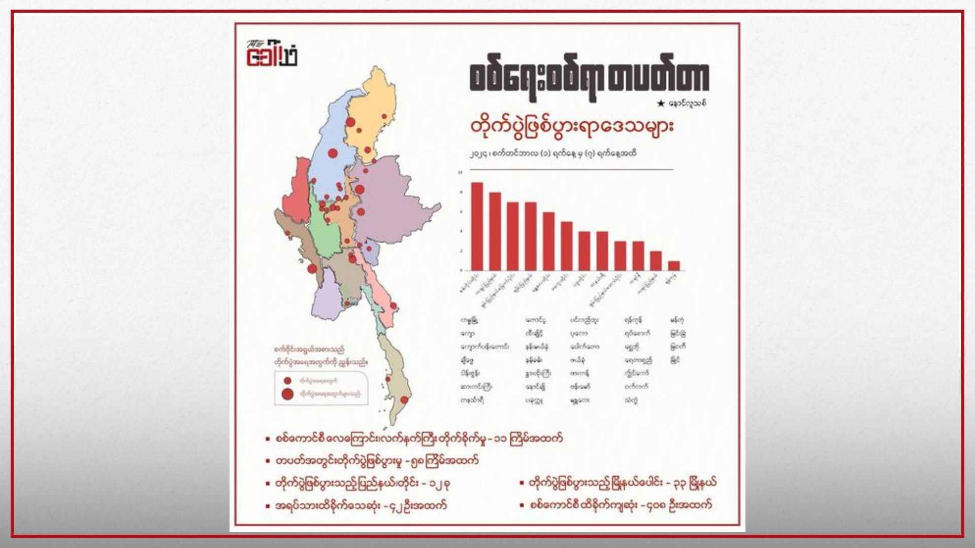 ● ဖော်ပြပါ အချက်အလက်များသည် သတင်းမီဒီယာ (၁၀) ခုမှ သတင်းများကို အခြေခံ ကောက်ယူ ထားခြင်းဖြစ်သည်။ တိုက်ပွဲနှင့် ထိခိုက်ကျဆုံး အရေအတွက်မှာ ဖော်ပြထားသည်ထက် ပိုမို များပြား နိုင်သည်။