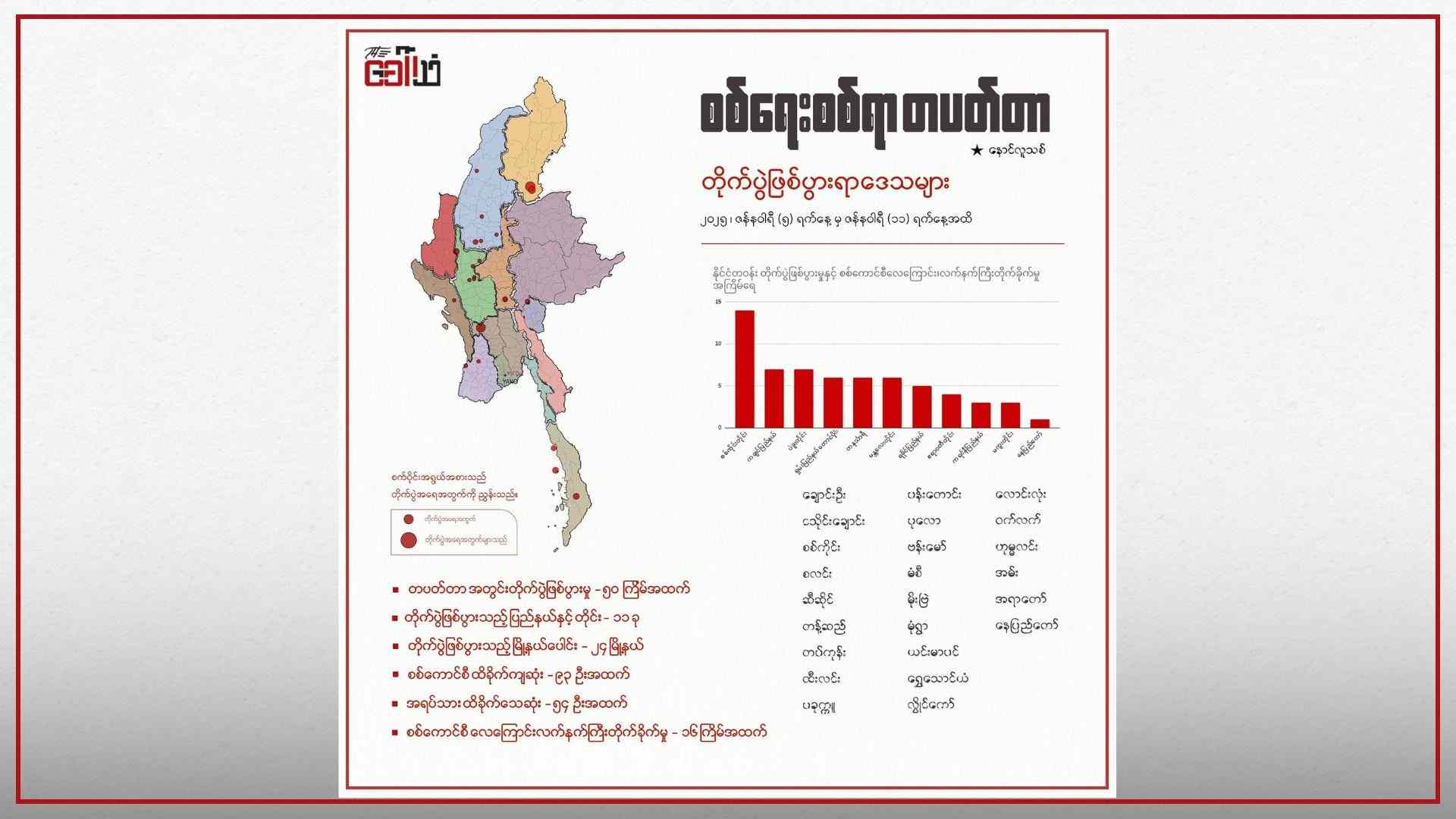 ● ဖော်ပြပါ အချက်အလက်များသည် သတင်းမီဒီယာ (၁၀) ခုမှ သတင်းများကို အခြေခံ ကောက်ယူထားခြင်းဖြစ်သည်။ တိုက်ပွဲနှင့် ထိခိုက်ကျဆုံး အရေအတွက်မှာ ဖော်ပြထားသည်ထက် ပိုမို များပြားနိုင်သည်။