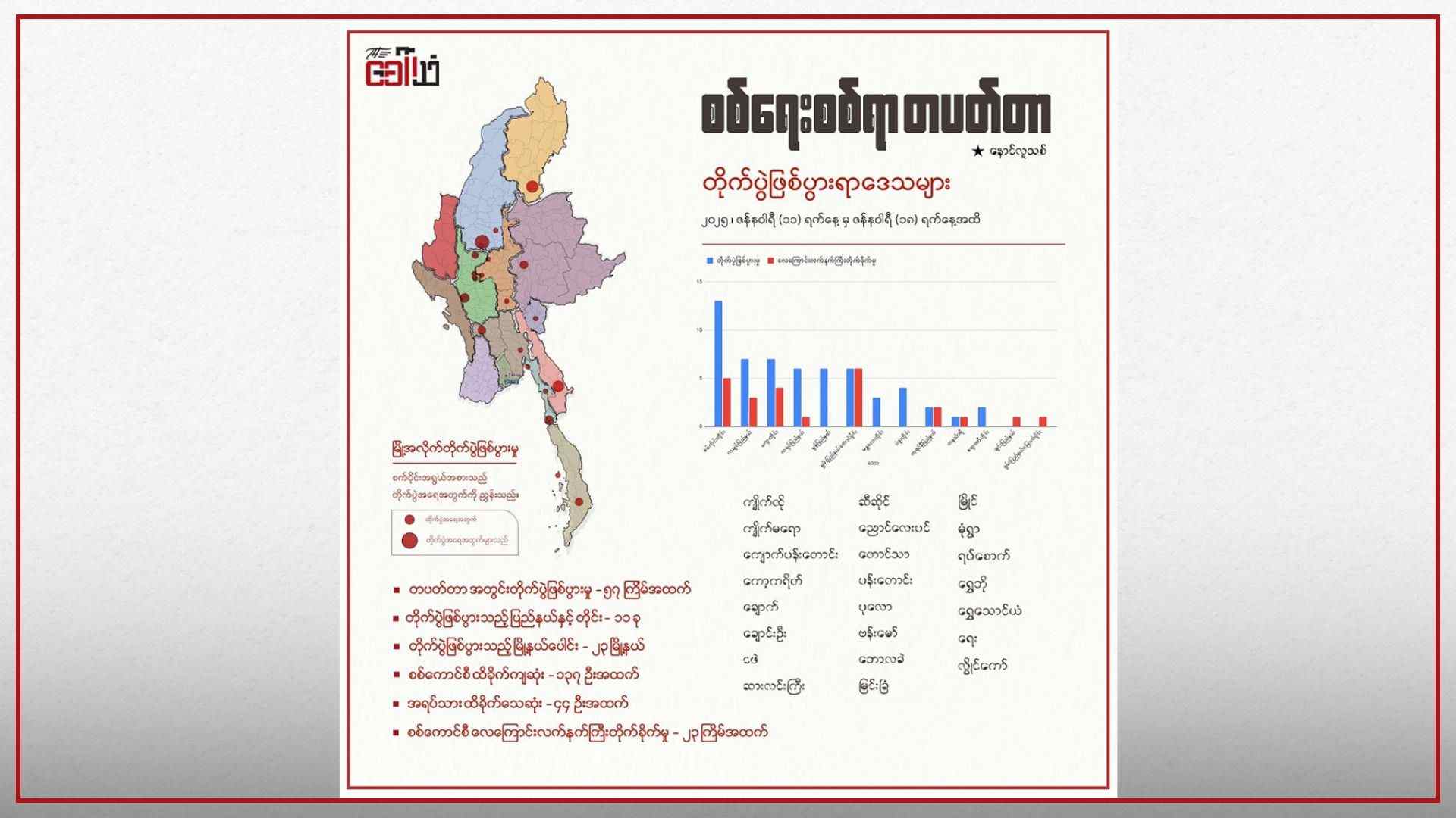 ● ဖော်ပြပါ အချက်အလက်များသည် သတင်းမီဒီယာ (၁၀) ခုမှ သတင်းများကို အခြေခံ ကောက်ယူထားခြင်းဖြစ်သည်။ တိုက်ပွဲနှင့် ထိခိုက်ကျဆုံး အရေအတွက်မှာ ဖော်ပြထားသည်ထက် ပိုမို များပြားနိုင်သည်။