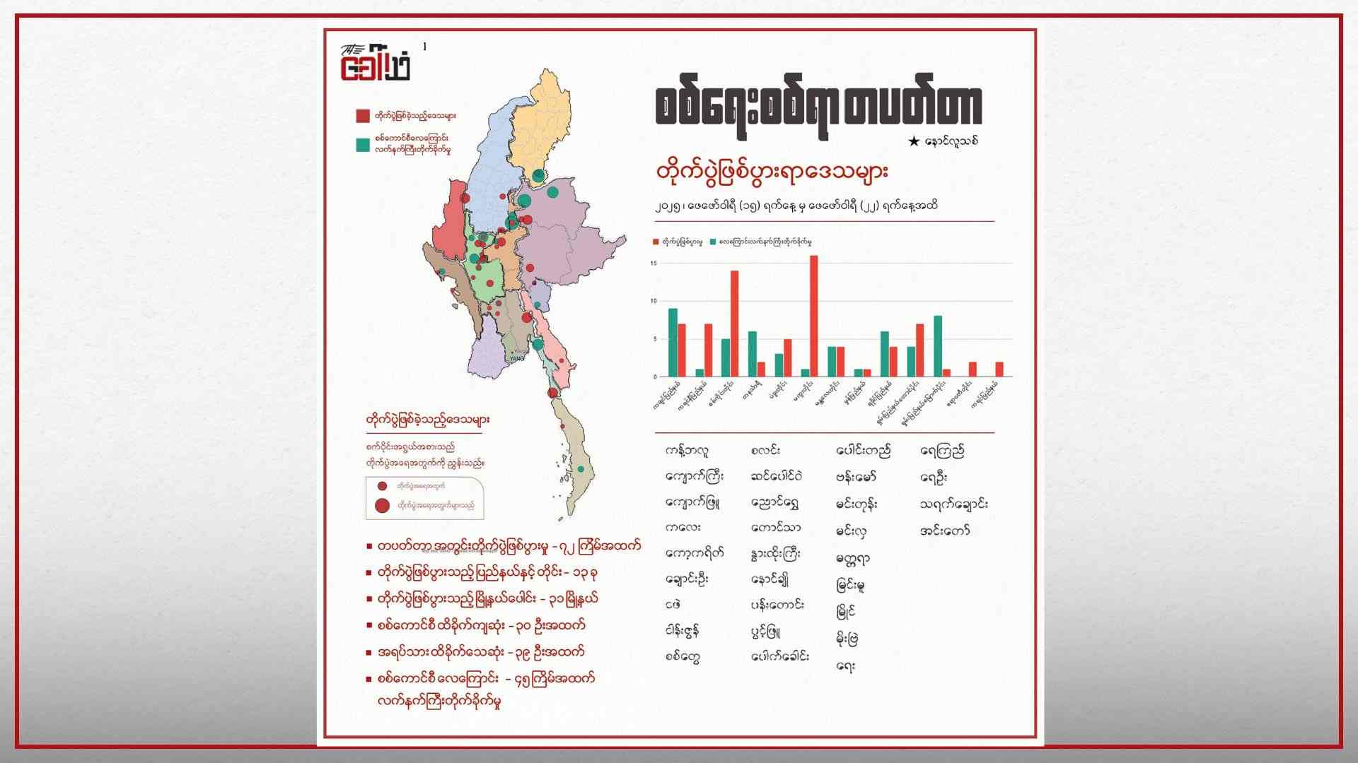 ☆ တပတ်တာအတွင်း နိုင်ငံတဝန်းရှိ ပြည်နယ်နှင့် တိုင်းဒေသ (၁၃) ခုတွင် တိုက်ပွဲများဖြစ်ပွားခဲ့ပြီး မြို့နယ်အားဖြင့် (၃၁) မြို့နယ် အထိ ရှိသည်။