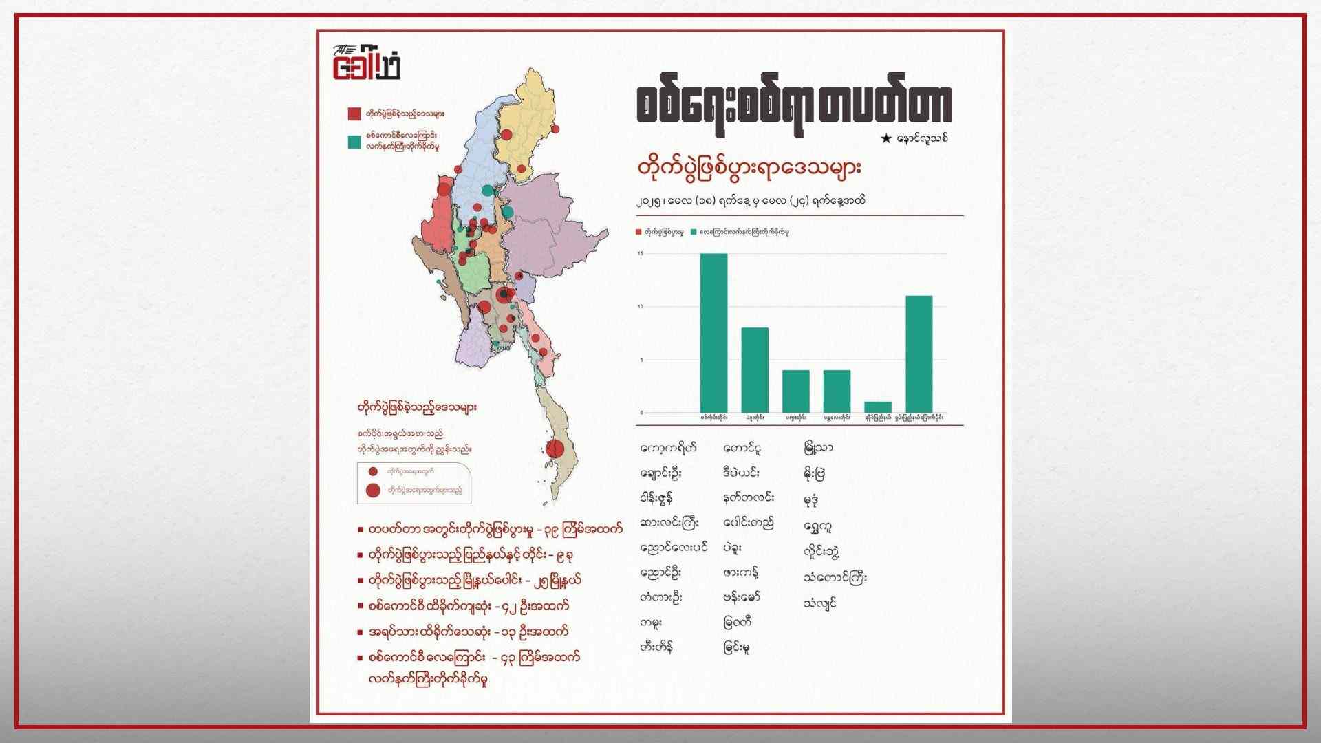 ☆ တပတ်တာအတွင်း တိုင်းဒေသပြည်နယ် (၉) ခုရှိ မြို့နယ်ပေါင်း (၂၅) မြို့နယ်တွင် တိုက်ပွဲများဖြစ်ပွားခဲ့သည်။