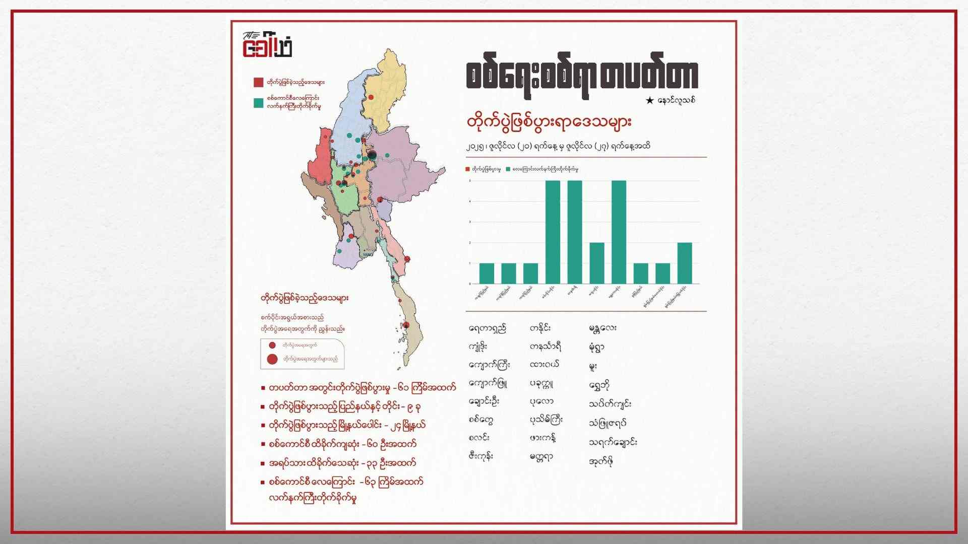 ☆ တပတ်တာအတွင်း တိုင်းဒေသပြည်နယ် (၉ ) ခုရှိ မြို့နယ်ပေါင်း (၂၄) မြို့နယ်တွင် တိုက်ပွဲများဖြစ်ပွားခဲ့သည်။