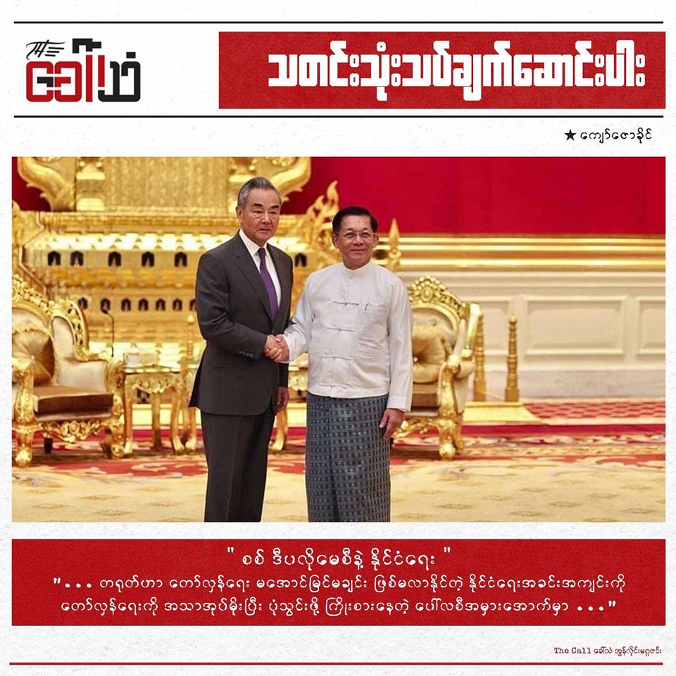 တိုက်ပွဲသတင်းတွေကြားထဲ ဒီတပတ်လုံး နိုင်ငံရေးသတင်းသုံးသပ်သူတွေ စိတ်ဝင်တစားပြောကြတဲ့ သတင်းကတော့ ဝမ်ယီ့သတင်းပါပဲ။ သြဂုတ် ၁၄ ရက်နေ့ နေပြည်တော်၊ ၁၅ ရက်နေ့ ချင်းမိုင်နဲ့ ၂၀ ရက်နေ့ ဘေဂျင်းဆွေးနွေးပွဲတွေကနေ တရုတ်ပြောချင်တဲ့ သဘောတရားကို အဝန်းအဝိုင်း ၃ ခု ခွဲမြင်ကြည့်လို့ရတယ်။