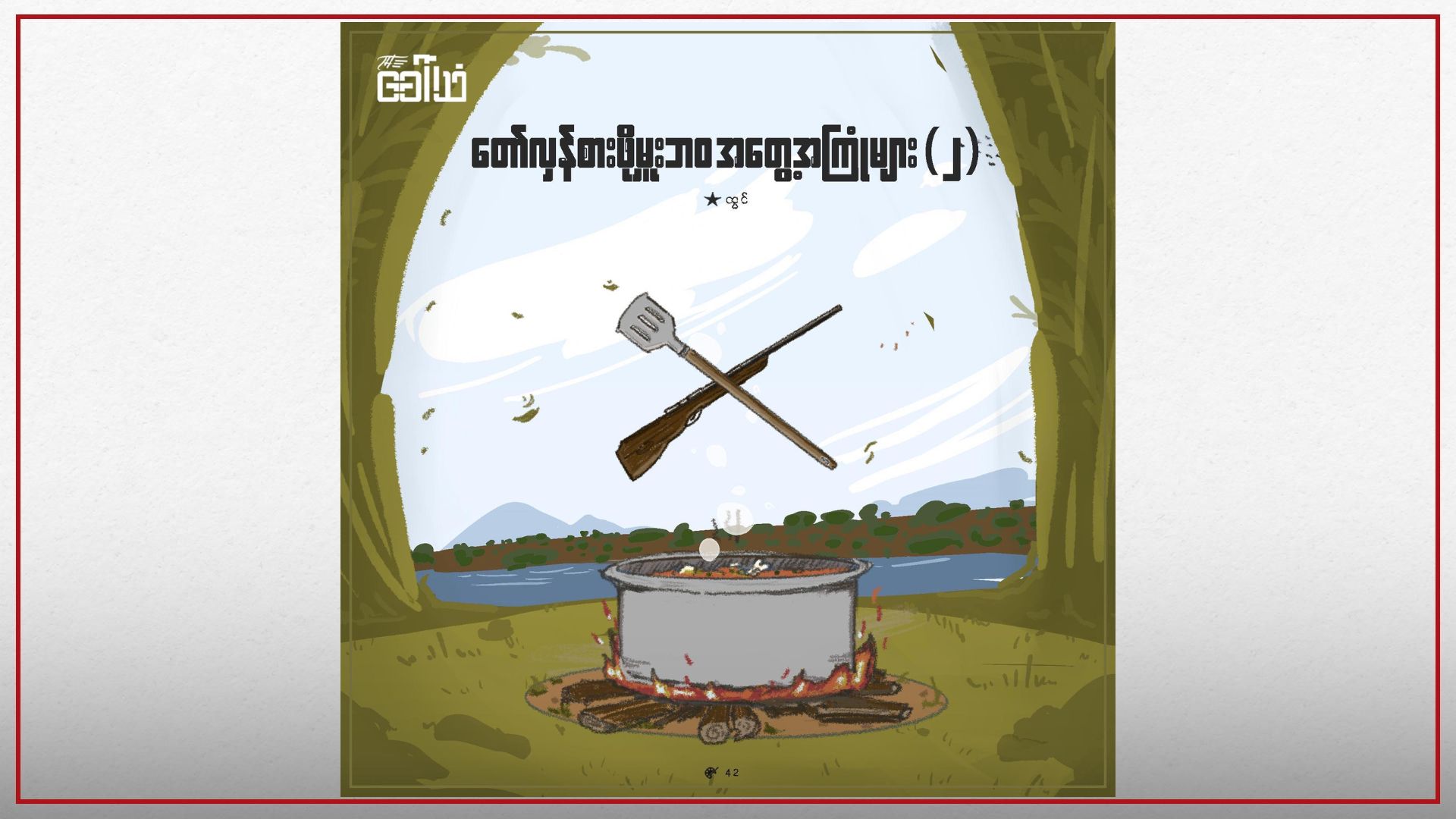 ပြီးတော့မှ ကျွန်ုပ်သည် ကိုယ့်ကိုယ်ကိုယ် နှစ်သိမ့်ကာ အားတင်းရပါသည်။ ငါကဆို ထမင်းလေးပဲ ချက်ရတာပါ။ အသက်လည်း မပေးရ၊ အသက်အန္တရာယ်နဲ့လည်း မနီးစပ်၊ ရှေ့တန်းလည်း မလိုက်ရ။ လုပ်ကြံချင်မည့် မနာလိုသူလည်း မရှိ။ ဟိုကောင်တွေဆို အသက်ပေးရသည်။ ရှေ့တန်းလည်း လိုက်ရသည်။ အချိန်မရွေး ERROR ဖြစ်ပြီး အသက်သေဆုံးနိုင်သည့်၊ ခြေတိုလက်ပြတ်၊ ဒုက္ခိတ၊ စိတ်ဒဏ်ရာရနိုင်သည့် အလုပ်မျိုးစုံတွေ လုပ်နေရသည်ပဲ။ သည်လို အများအကျိုးကို များများလုပ်နိုင်နေသည်ကို မချီးကျူးဘဲ၊ အကောင်းမြင်မပေးဘဲ မနာလိုစိတ်ဝင်ပြီး လုပ်ကြံချင်သူတွေက ပေါသေး၊ သူတို့လည်း ထမင်းသုံးနပ်ကလွဲလို့ ဘာအကျိုးအမြတ်၊ ဘာလစာ ရလို့လဲ။ သူတို့လည်း မိဘကို မထောက်ပံ့နိုင်။ ကိုယ်ကျိုးကိုစွန့်ပြီး အများအကျိုးကို ထမ်းရွက် နေရသူတွေချည်းပဲ။ သူတို့လုပ်ရပ်၊ သူတို့ဘဝနဲ့စာရင် ငါ့ပင်ပန်းမှုက ဘာမှမဟုတ်သေးပါဘူး။ ငါလည်း ထမင်းချက်ရင်း တော်လှန်ရေးကို တဘက်တလမ်းကနေ ပါဝင်နေသူပဲ။ အရေးတော်ပုံ အောင်မြင်အောင် ကြိုးစားပေးနေသူတွေကို ငါက ချက်ပြုတ်ပေးနေရတာပဲလေ။ လူလေလူလွင့်တွေအတွက် ချက်ပြုတ်နေရတာမှ မဟုတ်တာ။ ငါ့ပင်ပန်းမှုက ငါ့ရဲ့ပေးဆပ်ခြင်းပဲ။ ငါ့လုပ်ရပ်အတွက် ငါ့ကိုယ်ငါ ဂုဏ်ယူမယ်။