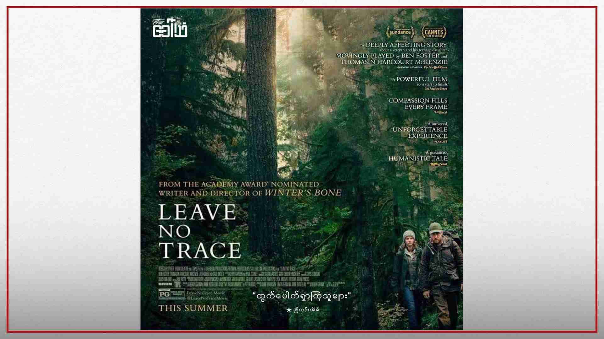 ဒီလိုနဲ့ Into The Wild ထဲက လူ့ဘဝကြီးကို ရွံရှာမုန်းတီးတဲ့လူငယ်။ ကိုရီးယားရုပ်ရှင် Castaway ထဲက ရှုံးနိမ့်လူသားတယောက်အကြောင်း။ ဒီ Leave No Trace မှာကျတော့ရော။ တောတောင်ထဲမှာပဲ မှီခိုရှင်သန်ကြတဲ့ ဖခင်နဲ့ မိတဆိုး ကလေးမလေးတို့ ဘဝတဲ့။ ကြည့်ရသူ ကျနော့်မှာ ထုံးစံအတိုင်း လူ့အဖွဲ့အစည်းရဲ့ ကိုက်ခဲမှုတွေ အကြောင်းကို စဉ်းစားရင်း သူတို့တွေကို ကြည့်ရင်း နာကျင်လို့ မဆုံး။ ဖခင်ဖြစ်သူက စစ်ပွဲရဲ့ ကိုက်ခဲမှုတွေကနေ စိတ်ဒဏ်ရာ ဗလပွနဲ့ လွင့်စင်ကျလာတဲ့ လူတယောက်။ သူ့ခမျာမှာ ဘယ်လိုမှ လူမှုဘုံထဲမှာ ရှင်သန်လို့မရ။ အဲဒီထဲမှာနေရရင် စိတ်ဖိစီးမှုတွေ စိတ်ဒဏ်ရာတွေက ဘယ်လောက် နှိပ်စက်ခံနေရသလဲ ဆိုတာ သူပဲ သိမြင်တဲ့ပုံ။ သို့ပေတဲ့လည်း သမီးကလေးကိုပါ ချစ်ရှာတော့ သူတယောက်တည်းလည်း တောတောင်ထဲမှာ မနေနိုင်ရှာ ။
