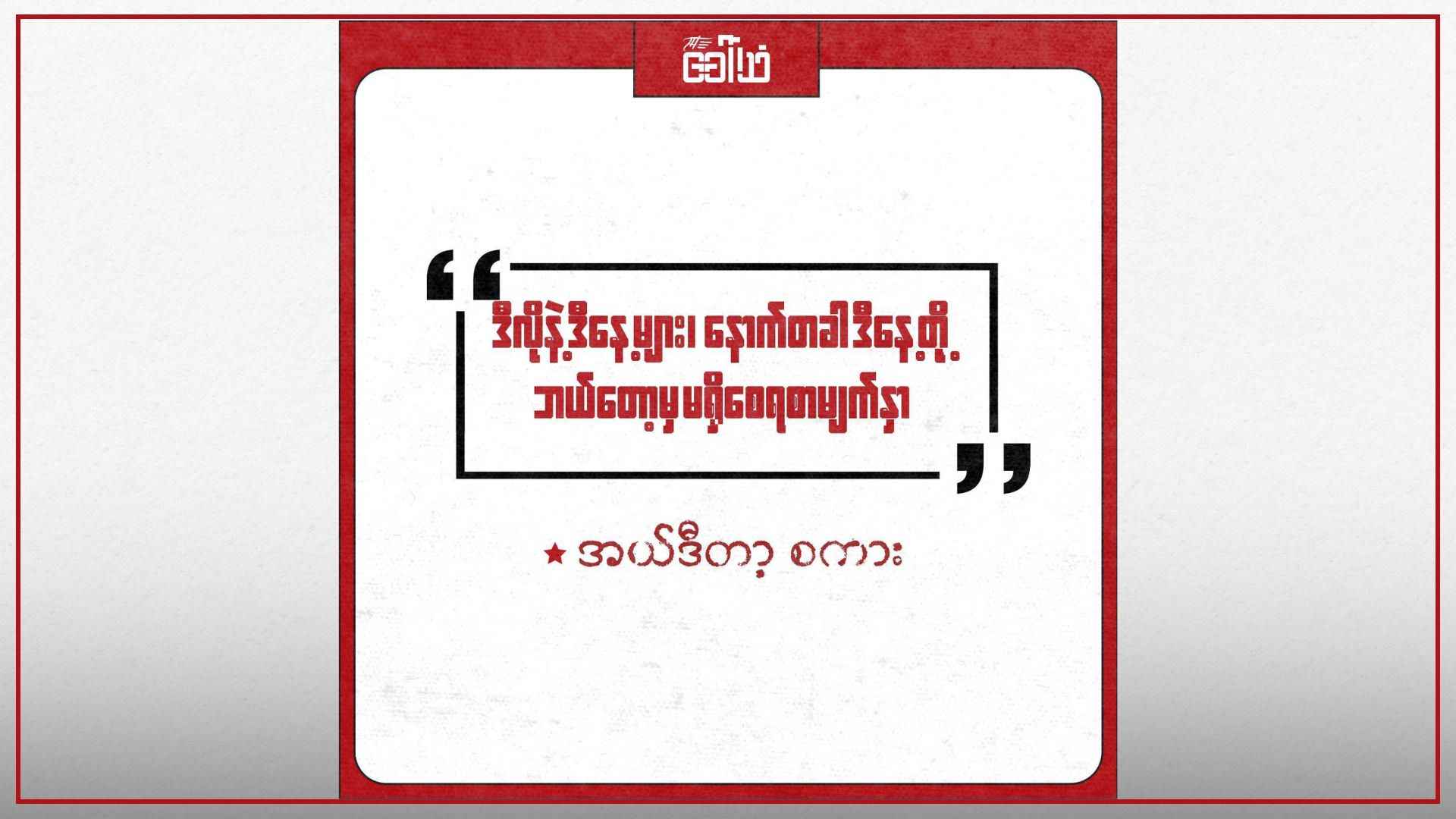 ဒီရေမဟုတ်ဘူး။ ကောက်ရိုးမီးမဟုတ်ဘူး။ တောက်လောင်မှုတိုင်းဟာ လောင်စာရဲ့အကန့်အသတ်ပေါ်အခြေခံတယ်ဆိုရင် ဒီအဓမ္မမှုကြီးကို ငြင်းဆန်ခဲ့တဲ့စိတ်ဓာတ်ဟာ မကုန်နိုင်မခမ်းနိုင် လောင်စာသိုက်ကြီးပဲ။ ဒါဟာ လူတယောက်ရဲ့ဖြစ်တည်မှု လူသားမျိုးနွယ်ရဲ့ဖြစ်တည်မှု အရင်းအမြစ်လည်းဖြစ်ရဲ့။