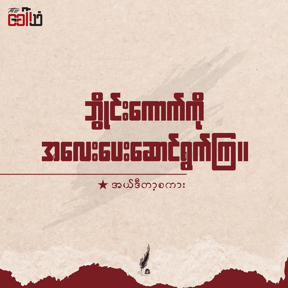 ယခုရင်ဆိုင်နေရသောတိုက်ပွဲသည် နည်းပညာတိုက်ပွဲဖြစ်သည်။ အနိုင်မခံ အရှုံးမပေးသော စိတ်ဓာတ်တိုက်ပွဲဖြစ်သည်။ အယူအဆသစ်များနှင့်ဖောက်ထွက်တိုက်ပွဲဖြစ်သည်။ စစ်မျက်နှာအစုံက မလစ်မဟာအောင် တိုက်နေသည့်ပွဲဖြစ်သည်။ ကဗျာဂီတနှင့်တိုက်သည်။ ရှေ့ထွက်မိုင်း၊ ပဒေသာမိုင်းနှင့်တိုက်သည်။ ဆူဆိုက်ဒရုန်းနှင့်တိုက်သည်။ အွန်လိုင်းကနေ Click to donate နှင့် တိုက်သည်။ Silent Strike နှင့် တိုက်သည်။ ၈ လေးလုံးရေးထားတဲ့ ထီး ၄ ချောင်းနှင့် တိုက်သည်။ သနပ်ခါးသပိတ်၊ ပန်းသပိတ်နှင့် တိုက်သည်။ 7 ၊ 7 ၊ 62 Don’t forget ဆိုတာနှင့် တိုက်သည်။