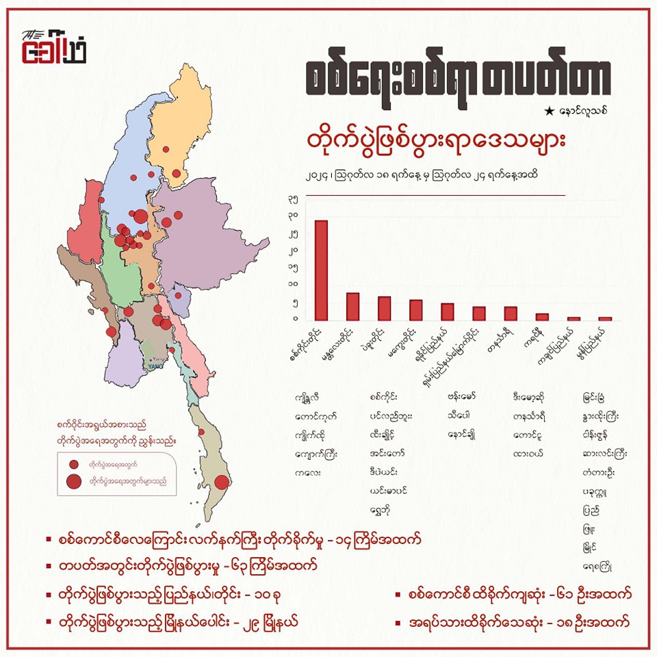 ☆ တပတ်တာအတွင်း နိုင်ငံတဝန်းရှိ ပြည်နယ်နှင့် တိုင်းဒေသ (၁၀) ခုတွင် တိုက်ပွဲများဖြစ်ပွားခဲ့ပြီး မြို့နယ်အားဖြင့် (၂၉) မြို့နယ်အထိ ရှိသည်။