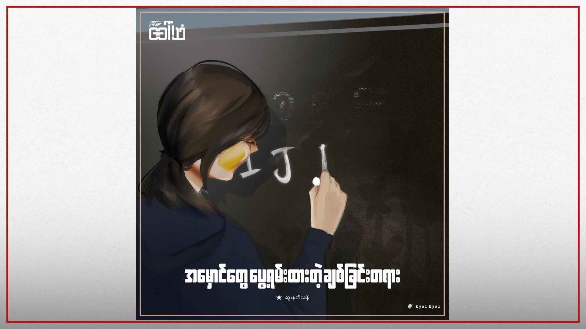 စာအုပ်နဲ့ သေနတ်ကို တလှည့်စီ ကိုင်တွယ်ရင်း ရင်ထဲငြိသွားတာ မြေဖြူကိုင်တဲ့ လက်ကလေးပါ။ ငါးနှစ်သားကလေးတွေရှေ့ ခဲတံချွန်ပေးနေတဲ့ လက်ကလေးပါ။ စပါးစိုက်လိုက် ခဲတံချွန်လိုက် မြေဖြူကိုင်လိုက် လက်ကလေးကို စိတ်မှန်းနဲ့ နမ်းရတာ လှိုက်လှိုက်လှဲလှဲ ကြည်နူးမိတယ်။