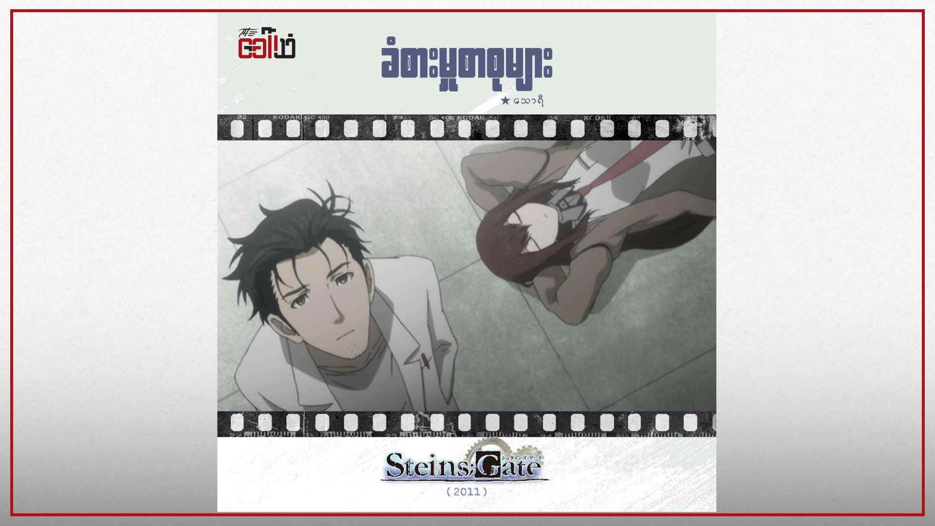 သွေဖီခြင်းများ။ တလက်လက်ထနေတဲ့ အချိန်လိုင်းများ။ ထိချက်ဖွဖွလေးနဲ့တင် အချိန်လိုင်းလေးတွေ ဖွာခနဲ ကွဲသွားတဲ့အခါ မင်းနဲ့ငါခွဲခွာဖို့ ဖြစ်တန်စွမ်းတွေဟာ သိန်းသောင်းချီသတဲ့။ အဲ့ထက်တောင်ပိုဦးမယ်။ ကိုယ်လုပ်နိုင် တာက အဲ့ဒီ့လွဲချော်မှု ဖြစ်တန်စွမ်းတွေကို ရသလောက် ပြန်လည်ပြင်ဆင်ကြည့်ဖို့ပဲ။