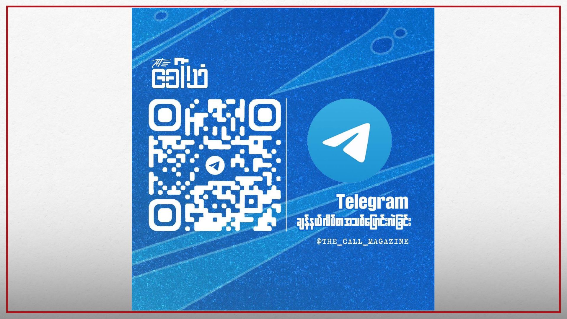 ‘The Call – ခေါ်သံ’ အွန်လိုင်းမဂ္ဂဇင်းကနေ နေ့စဥ်တင်ဆက်ပေးနေတဲ့ စာပေရသ ကဏ္ဍမျိုးစုံ အဖုံဖုံကို The Call – ခေါ်သံ ရဲ့ Telegram ချန်နယ်အသစ်ဖြစ်တဲ့ https://t.me/The_Call_Magazine ကို join ပြီး အစဥ်မပြတ် ဆက်လက်ဖတ်ရှုနိုင်ပြီ ဖြစ်တဲ့အကြောင်း စာဖတ်ပရိသတ်များကို အသိပေး ပန်ကြားလိုက်ပါတယ်။